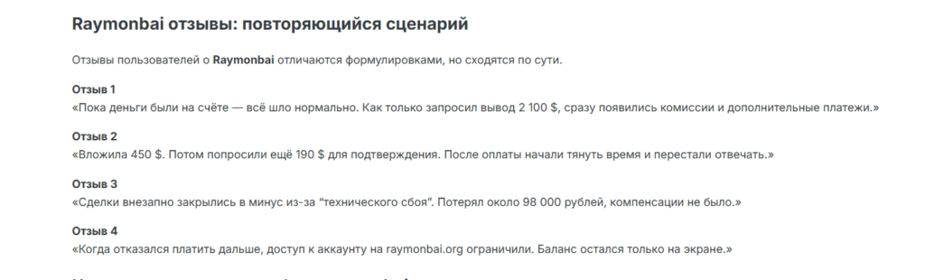 По сообщениям пользователей, имевших опыт взаимодействия с Raymonbai, основная претензия заключается в несоответствии обещаний реальности.