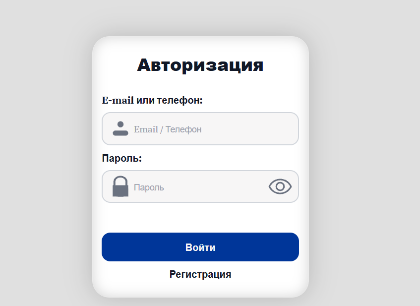 Ключевая особенность проекта — невозможность ознакомиться с условиями до создания аккаунта. На главной странице пользователю предлагается форма авторизации (E-mail/телефон и пароль).