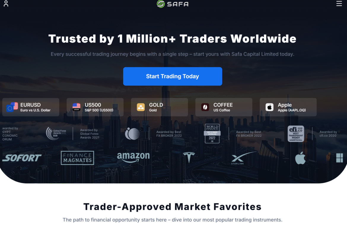 Визуально сайт выполнен в современном стиле: темная цветовая гамма с акцентами на зеленый (логотип SAFA), качественные фоновые изображения финансовых мегаполисов (Дубай, Нью-Йорк), крупные заголовки и кнопки призыва к действию («Start Trading Today»). Интерфейс адаптивный, поддерживает 8 языков: английский, русский, арабский, испанский, итальянский, чешский, польский и французский. Навигация простая — основные разделы: Home, Markets, Trading, About, Education, Tools. На главной странице выделены популярные инструменты (EURUSD, US500, GOLD, Apple и другие) с реал-тайм котировками, что создает ощущение динамики и прозрачности.